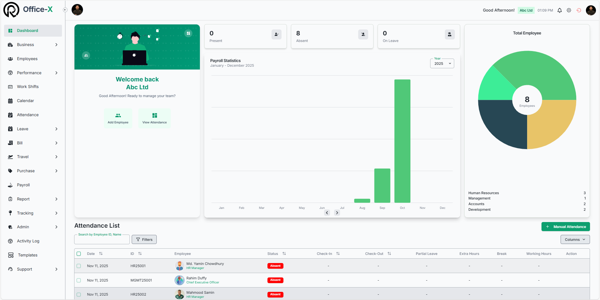 Office-X is an all-in-one SaaS platform for office and business management, ideal for small to enterprise-level businesses. It simplifies employee management, office operations, payroll (Bangladesh only), and more in one secure system.