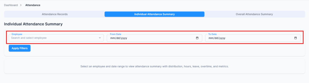 The Individual Attendance Summary tab provides a complete overview of a single employee’s attendance within a selected time range. This feature helps admins and managers quickly analyze work patterns, attendance behavior, and productivity using both data and visual charts.