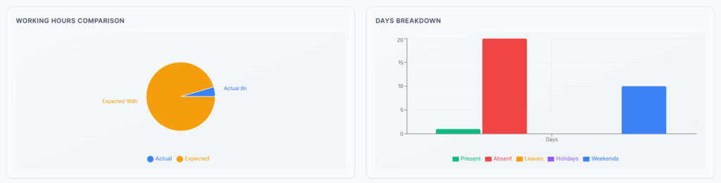✔ Days Breakdown – Visualizes the distribution of present days, absent days, leave days, holidays, and weekends.